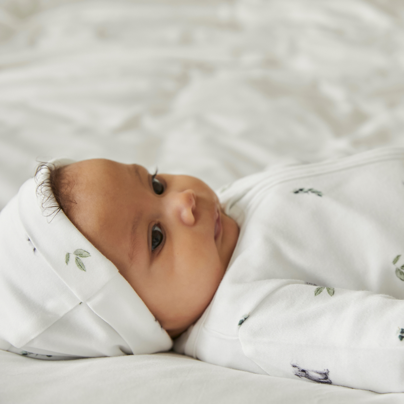 Our hand-painted Koala and eucalyptus design is printed onto a beautiful, bright white base. Choose from our best selling new baby essentials and award winning sleepsuits