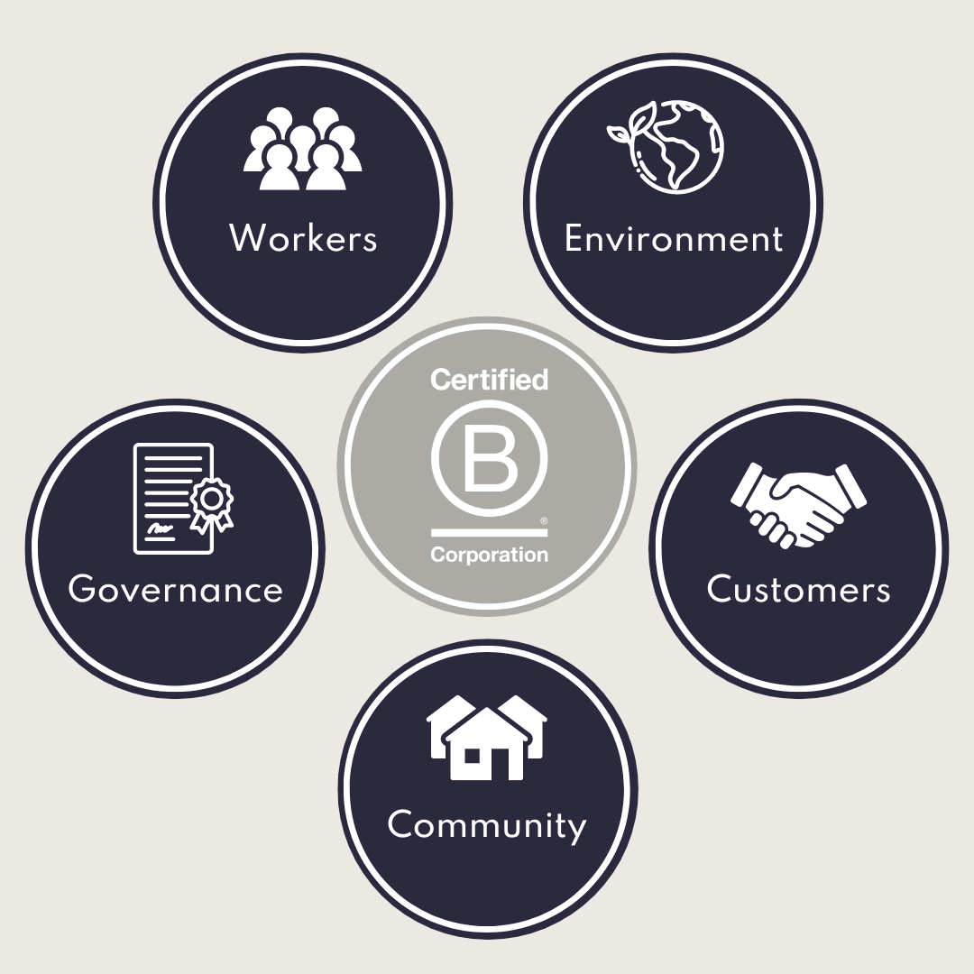 We were assessed on each Impact Pillar & awarded points based on our efforts. As of February 2024, there are 8,254 certified B Corporations® across 162 industries in 96 countries. Each of these business have been carefully assessed by B Lab® to ensure their suitability